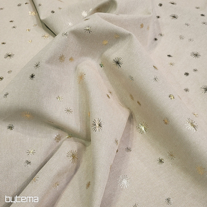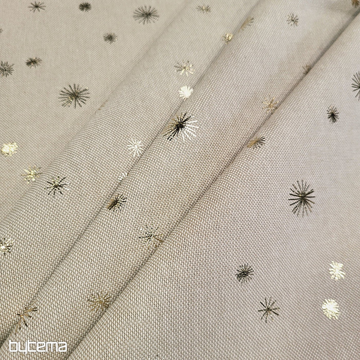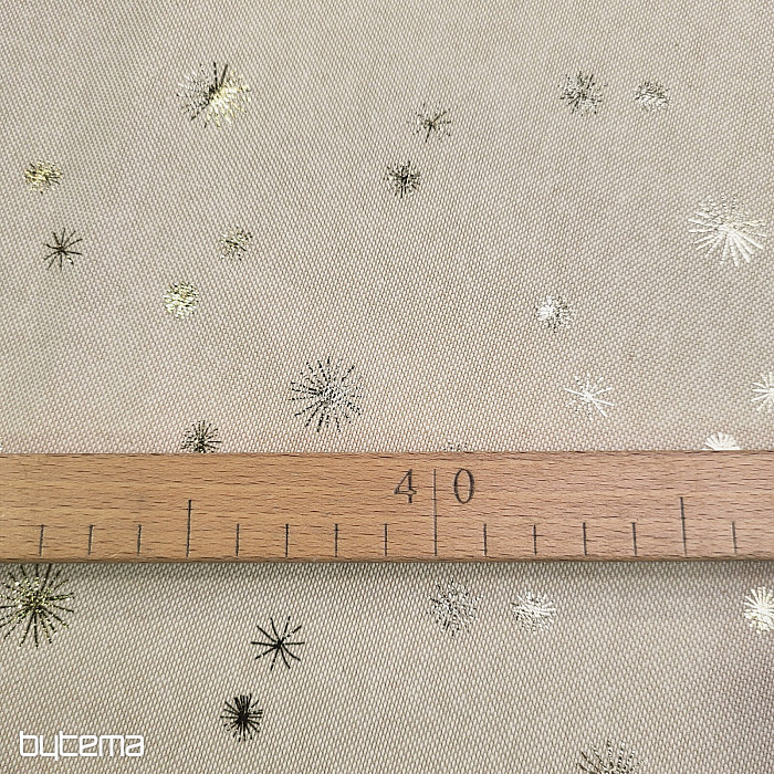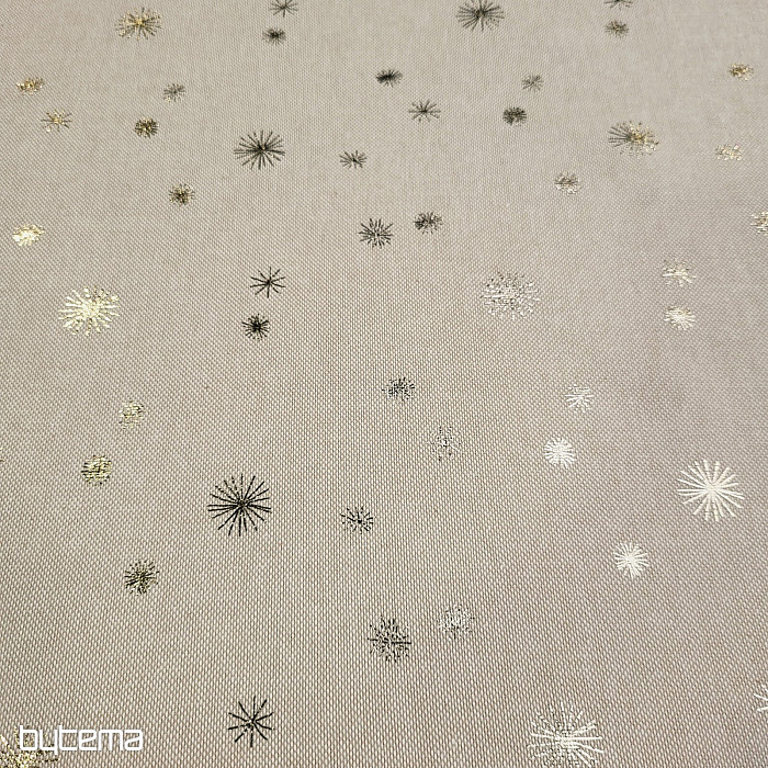Hrubšia bavlna-CANVAS látka s vianočnými zlatými hviezdami či vločkami na režnom podklade, sa krásne hodí na obrusy, prestierky alebo obliečky na vankúše.