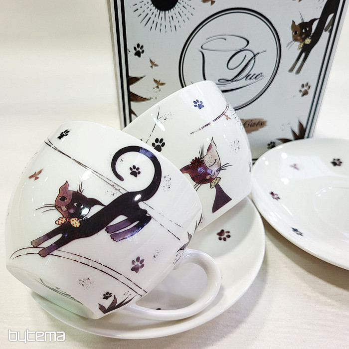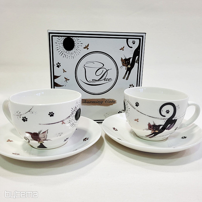 Dve šálky s objemom 280 ml sú vyrobené z porcelánu, rovnako tak dve podšálky. Celý set je zabalený do papierovej krabičky s potlačou.