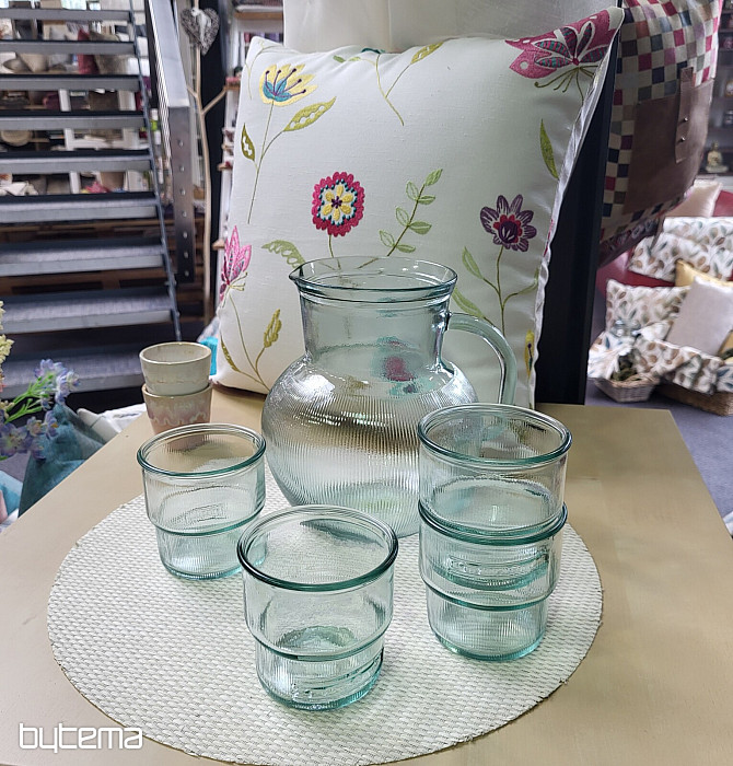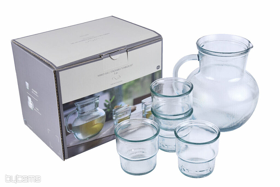 Krásny džbán a 4 kusy pohárov v darčekovom balení zo 100% recyklovaného skla. Sklo je číre, priehľadné. Vyrábané s ohľadom na životné prostredie a štýl vášho domova.