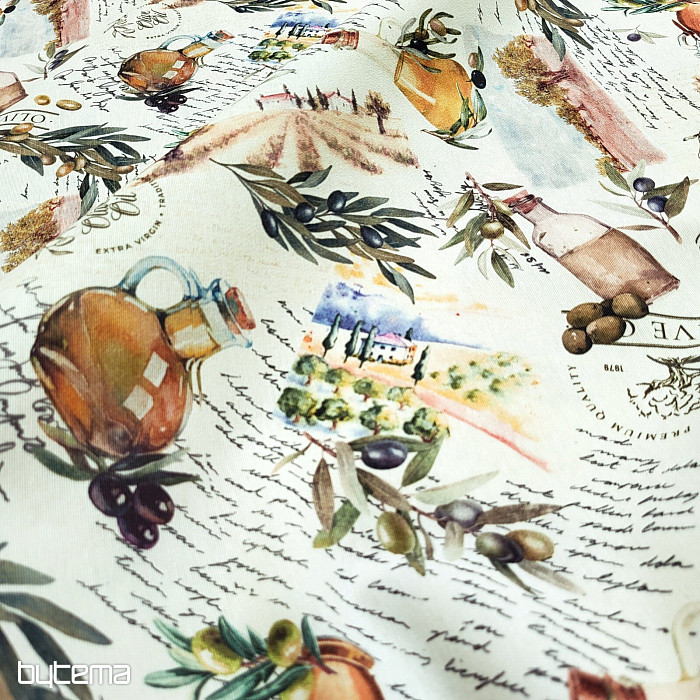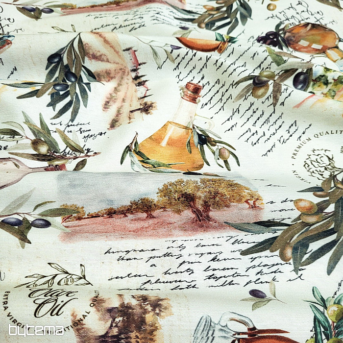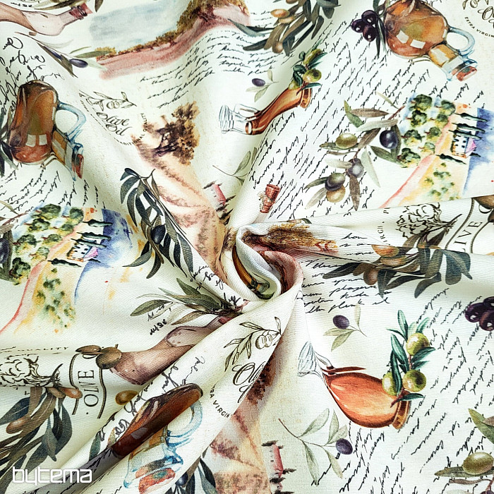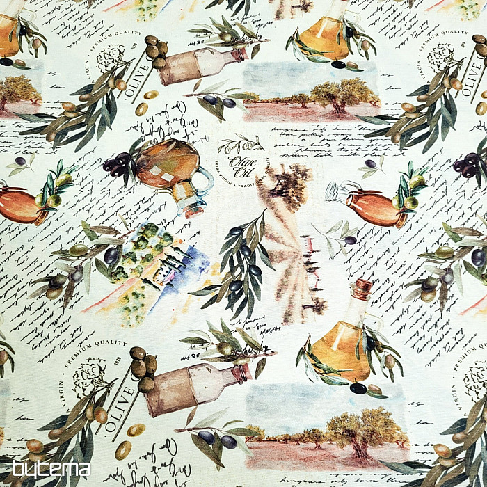Dekoračná látka s motívom olív pôsobí sviežo, stredomorsky a hodí sa do kuchyne, jedálne alebo na letné dekorácie.