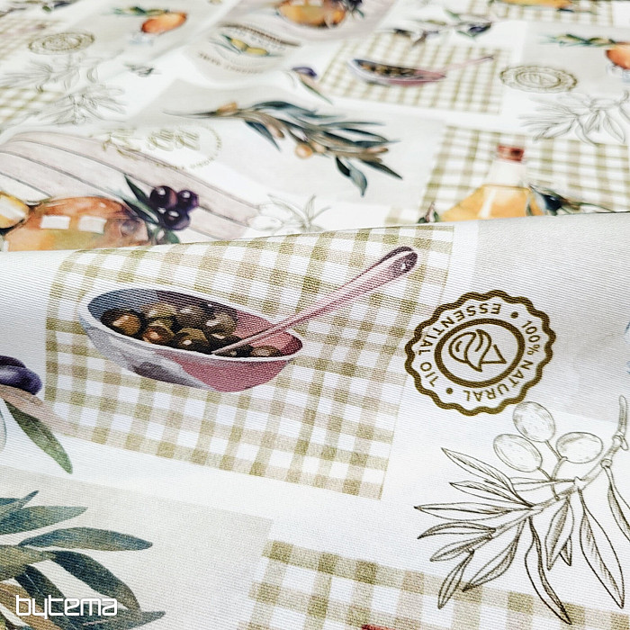 Dekoračná látka s motívom olív pôsobí sviežo, stredomorsky a hodí sa do kuchyne, jedálne alebo na letné dekorácie.