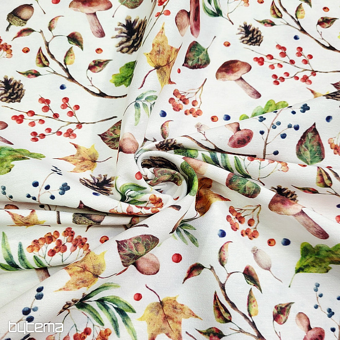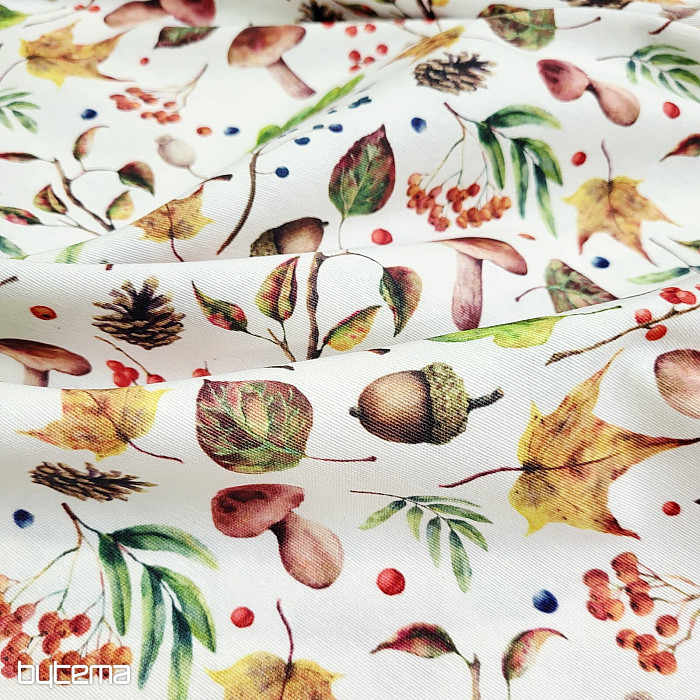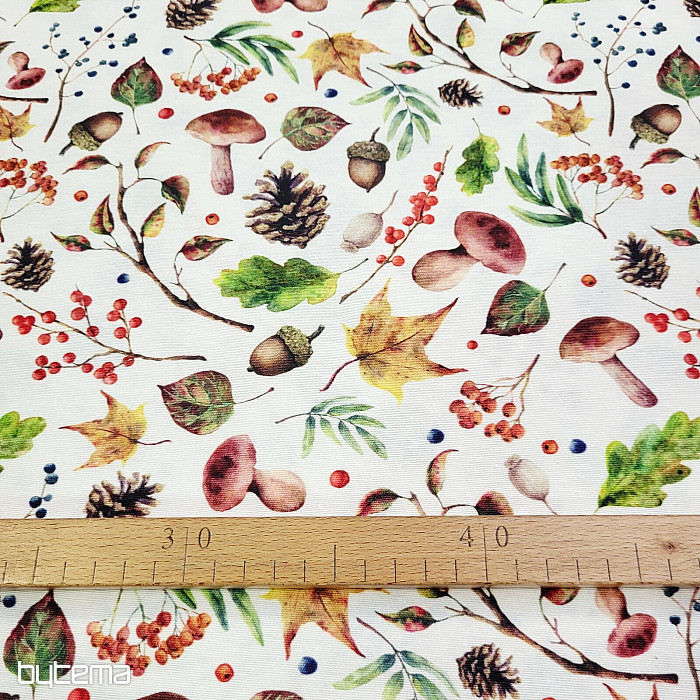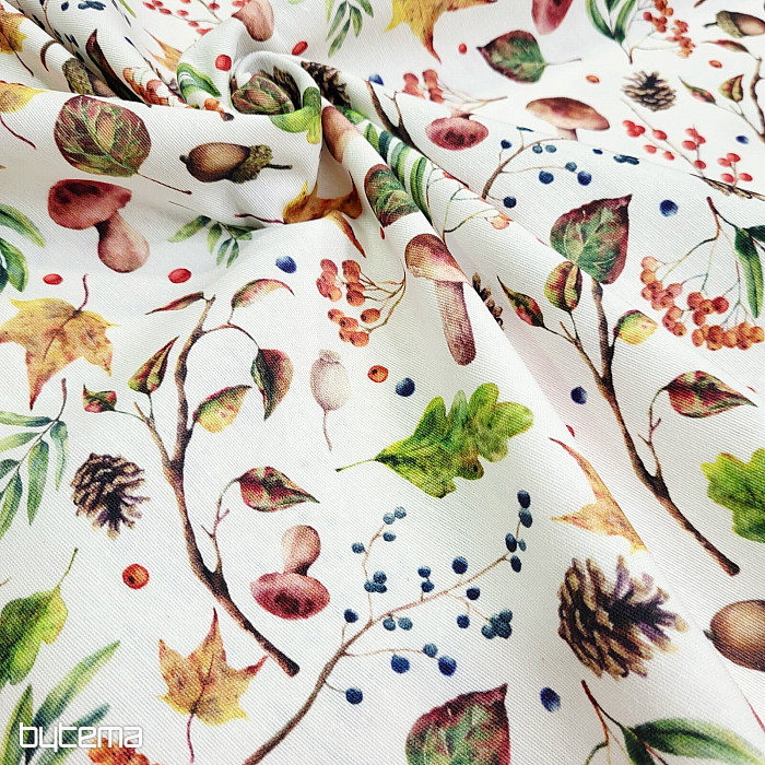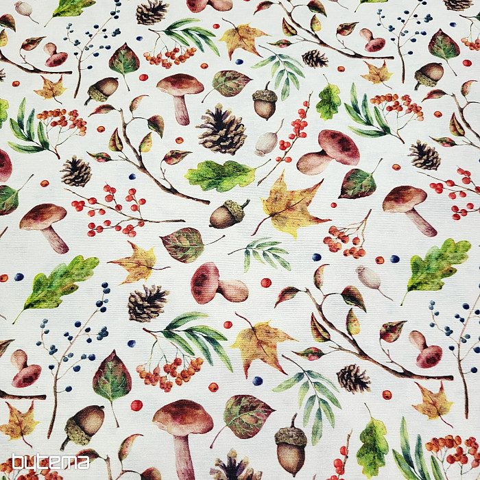 Jesenná dekoračná látka plná lesných plodov a listov poteší oko každého chatára i chalupára.