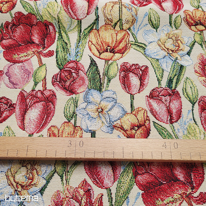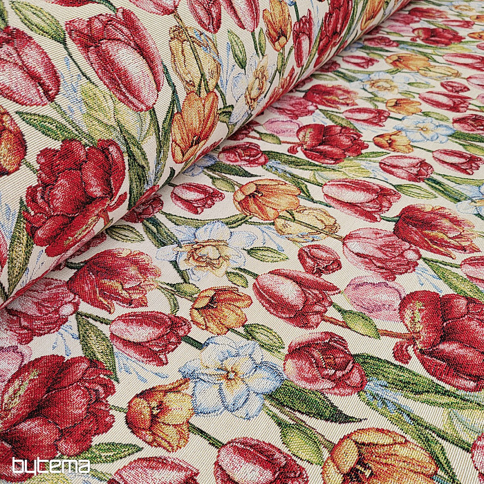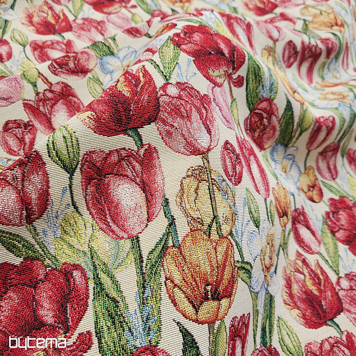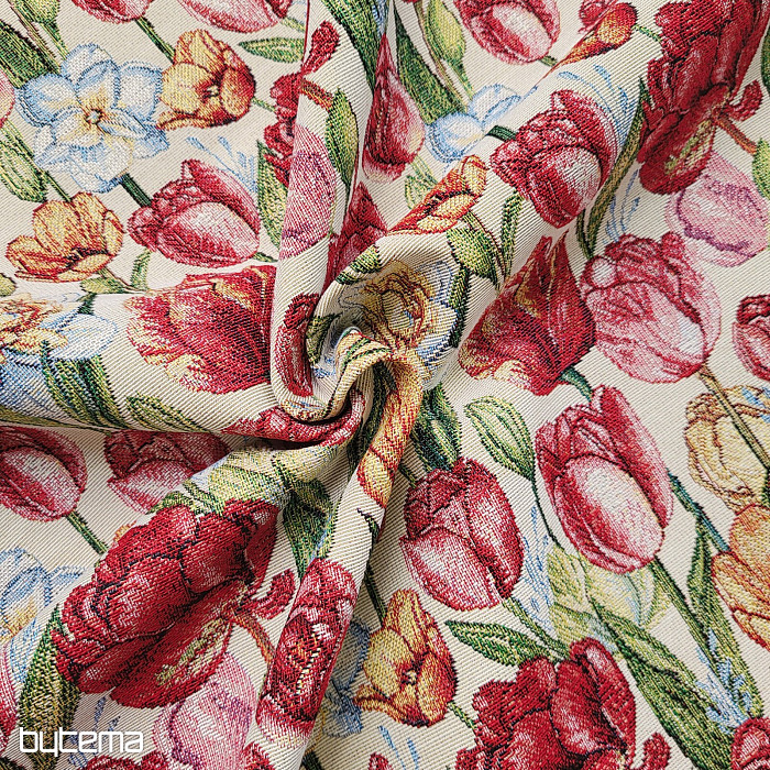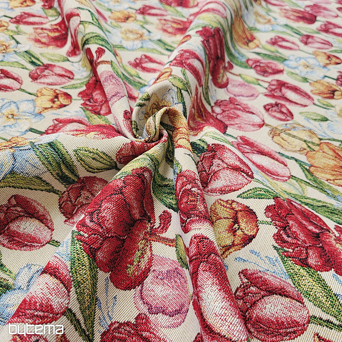 Nádherná gobelínová látka s jarnými kvetmi tulipánov a narcisov. Úžasná farebná záplava kvetov a jari na vašom stole u vás doma.