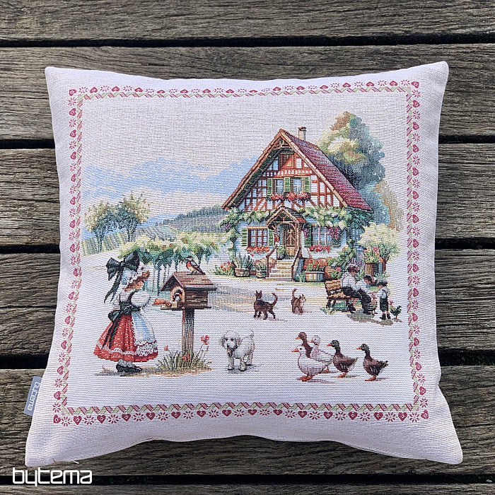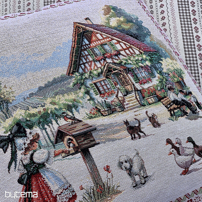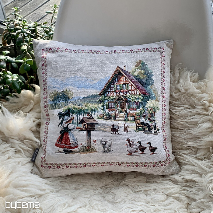 Gobelínový obliečka na vankúš s dizajnom vidieckeho stavenia a dvorom plného zvieratiek. Krásna a poetická dekorácia do každej kto má túto scenériu rád.