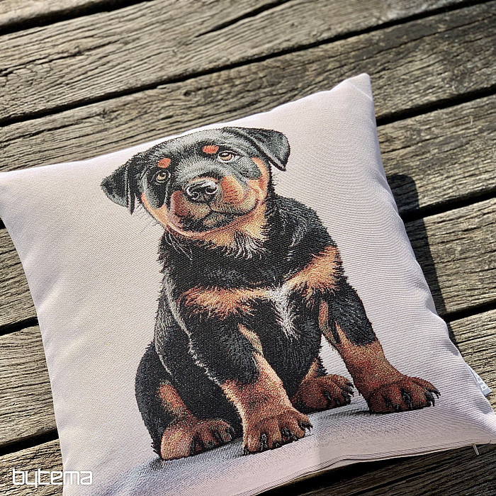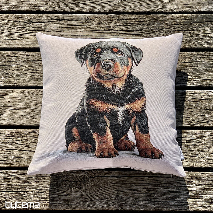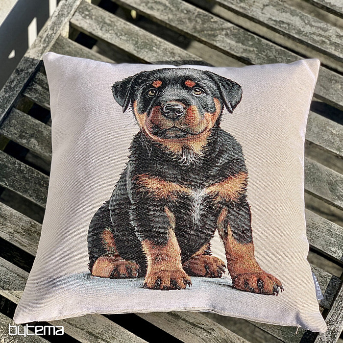 Gobelínový obliečka na vankúš so šteniatkom rotvajlera. Krásny darček pre milovníkov tohto plemena.
