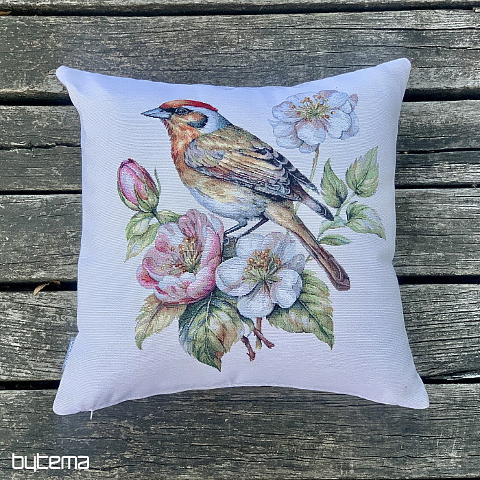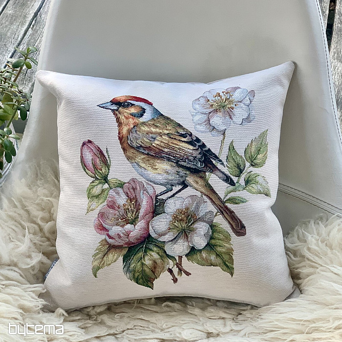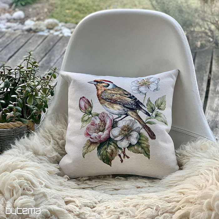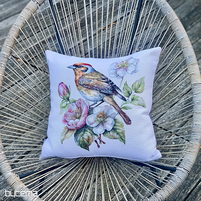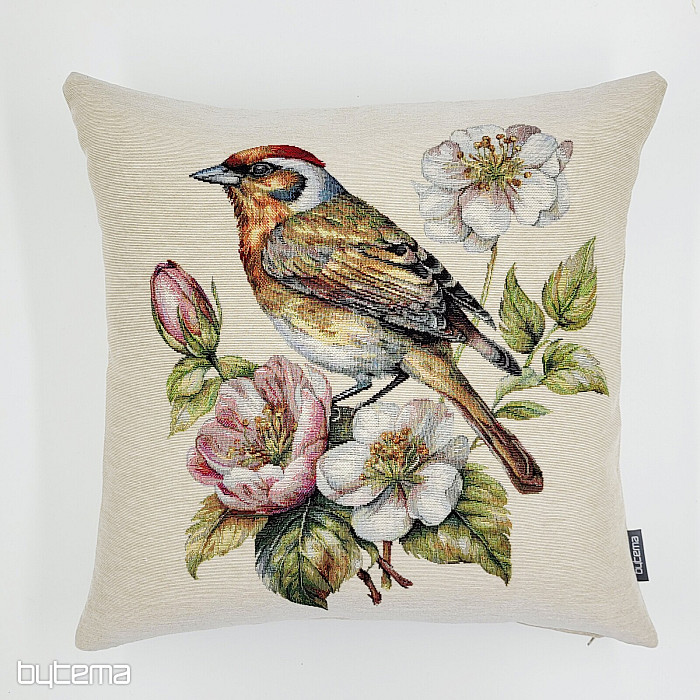 Gobelínový obliečka na vankúš so stehlíkom na rozkvitnutej jabloni bude krásnou dekoráciou pri vítaní jari.