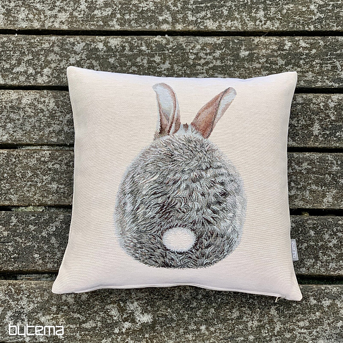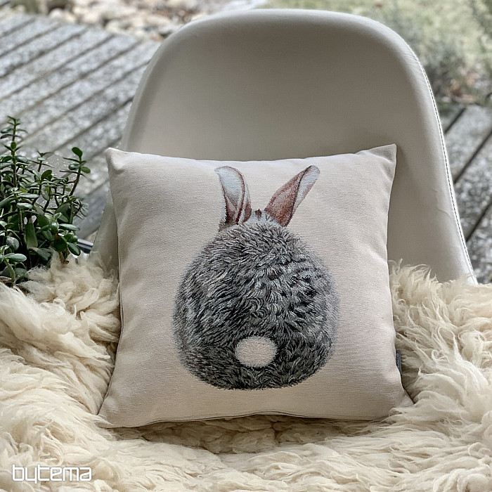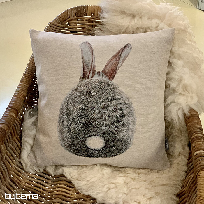 Gobelínový obliečka na vankúš so zajacom Hopsálkom, teraz zo zadnej časti. Krásna a úsmevná dekorácia nielen na Veľkú noc.