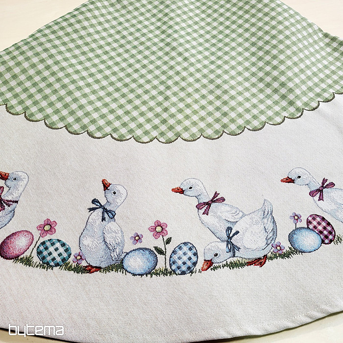 Veľkonočný gobelínový okrúhly obrus so zeleným károm a husičkami. Krásna dekorácia pre váš okrúhly stôl.