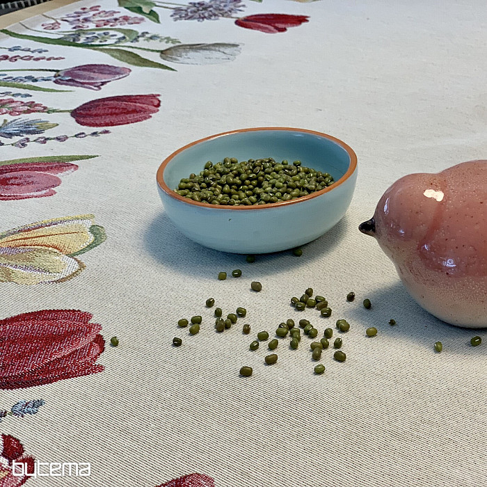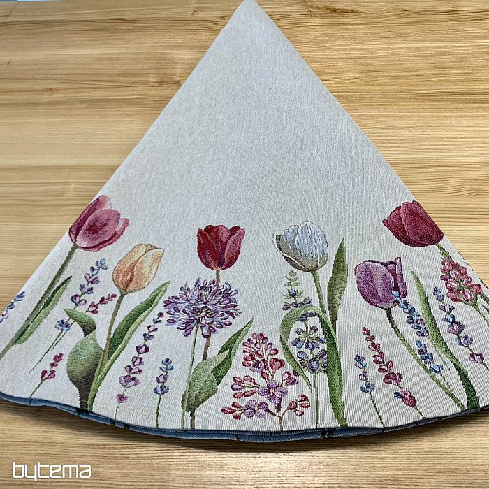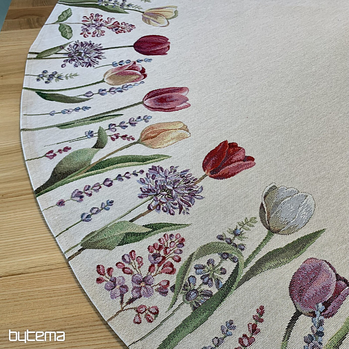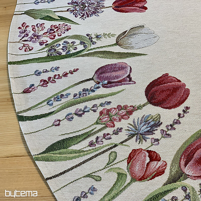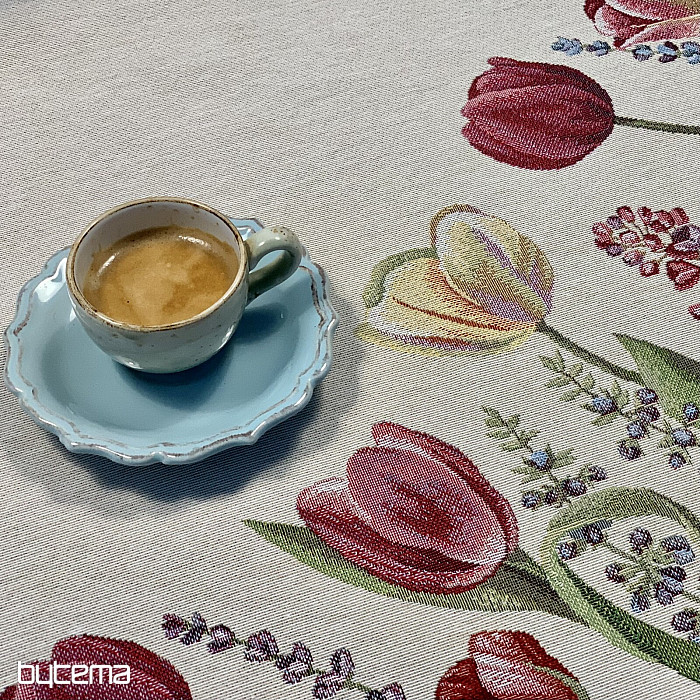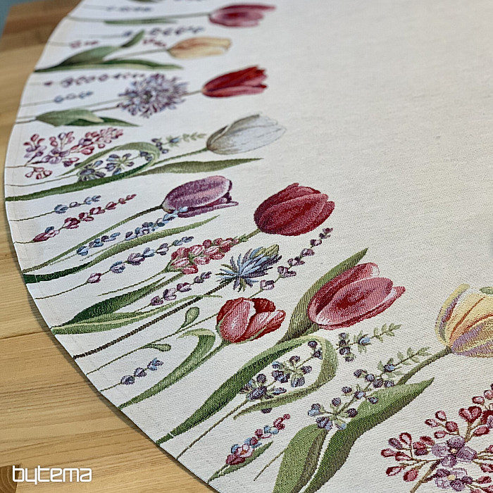 Motív jarných tulipánov na tomto gobelínovom obruse je kúzelný. Vaša jedáleň celá rozkvitne.