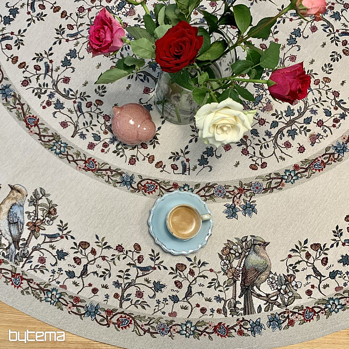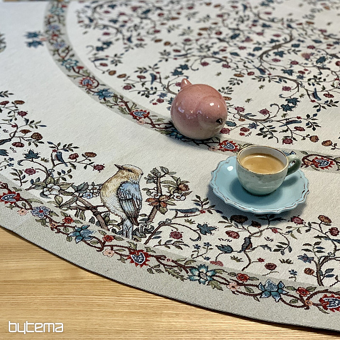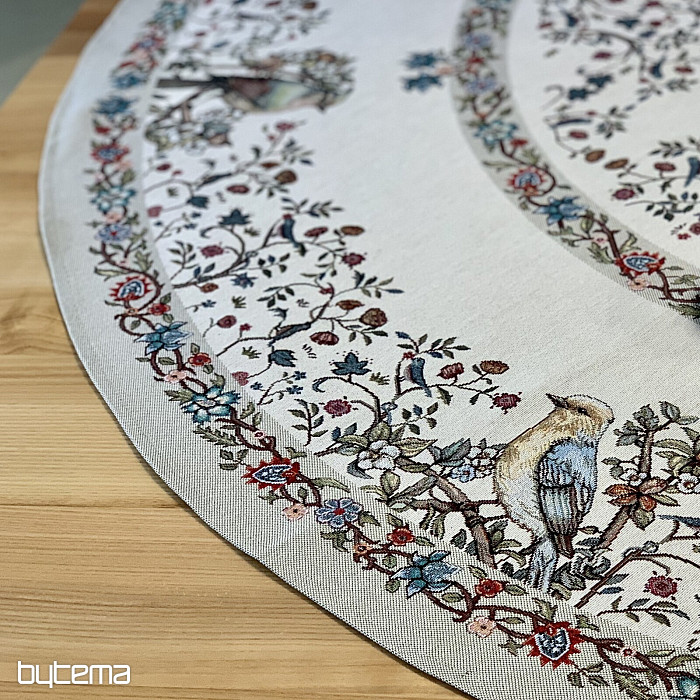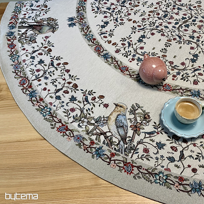 Nádherný okrúhly obrus z pevného gobelínu s vtákmi a kvetmi v rôznych farbách. Dokonalý doplnok či darček pre milovníkov vtáctva.