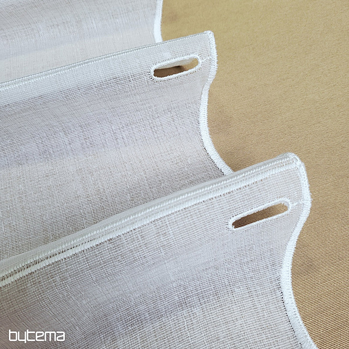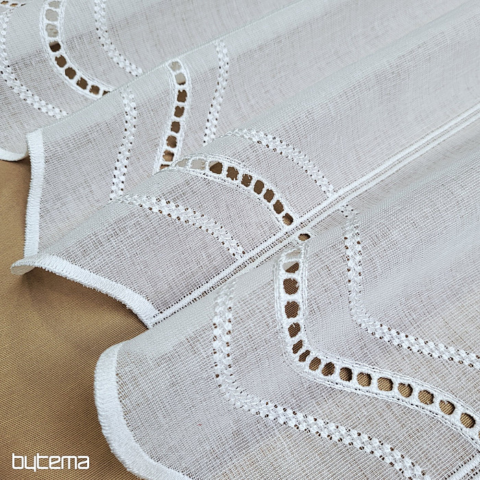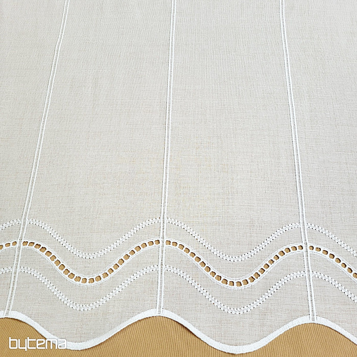 Moderná jednoduchá vyšívaná záclonka na vitrážku. Nie je nutné zapošívať, pretože sa strihá vo vyšitých čiarach cca po 15 cm. Materiál má prírodný až jemne plátnový - ľanový vzhľad.