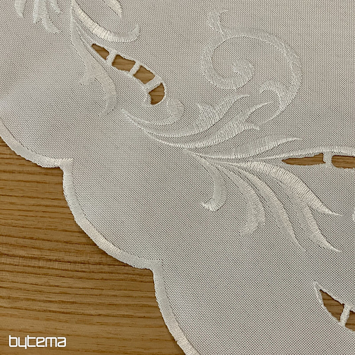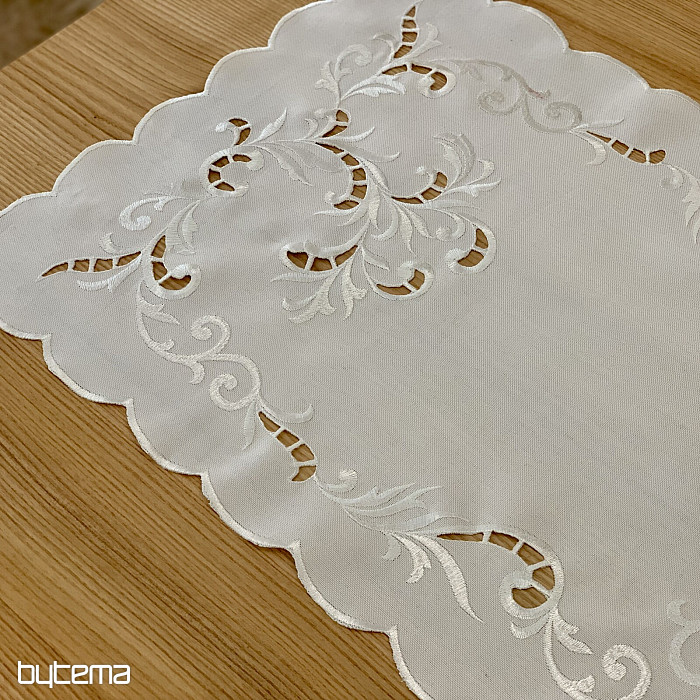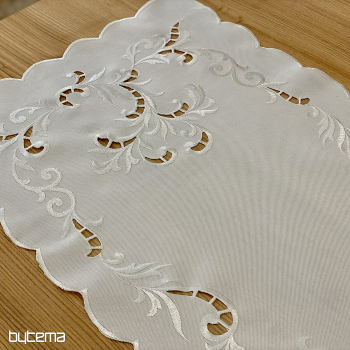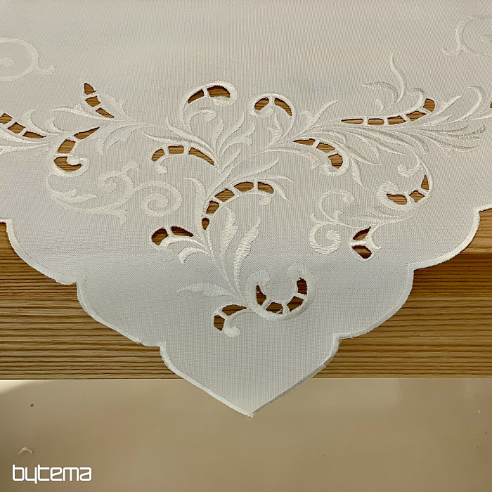 Delikátny obrus vyšívaný s ažúrou, vhodný na slávnostné príležitosti.
