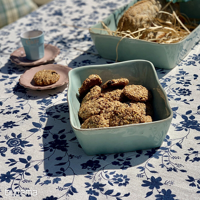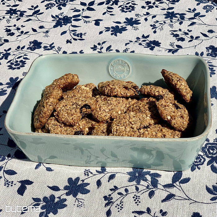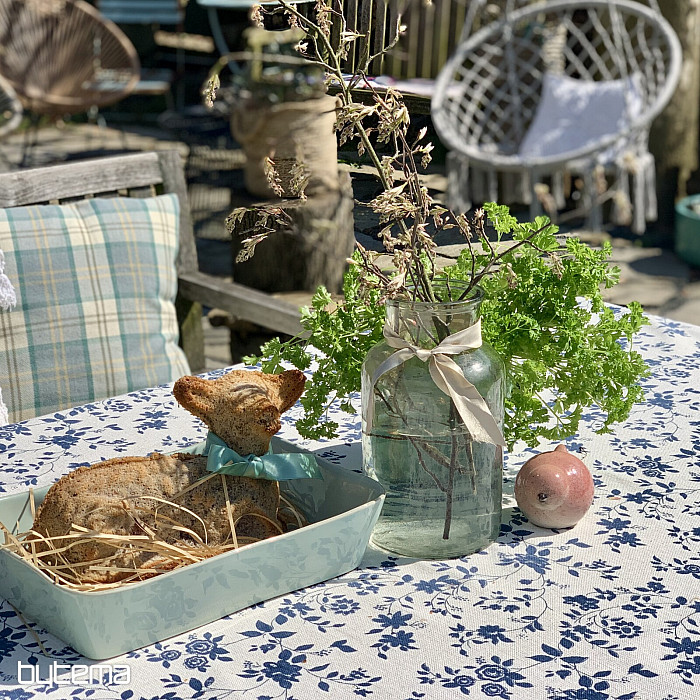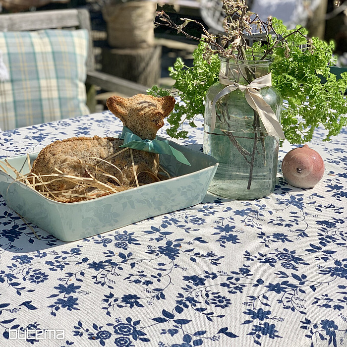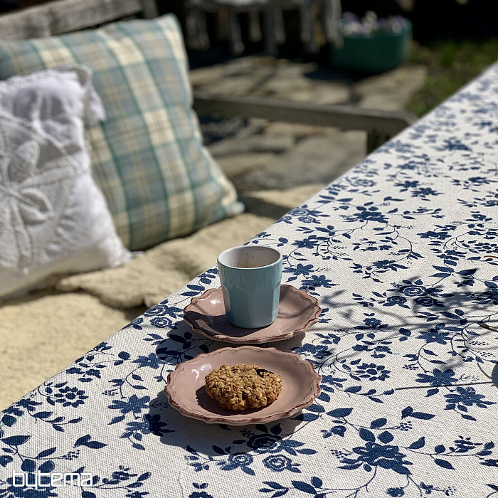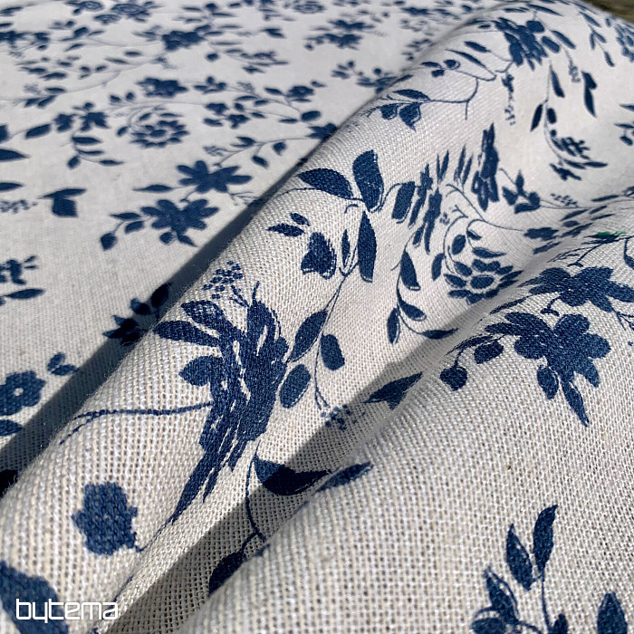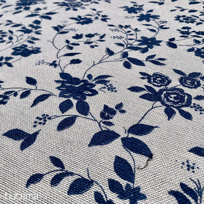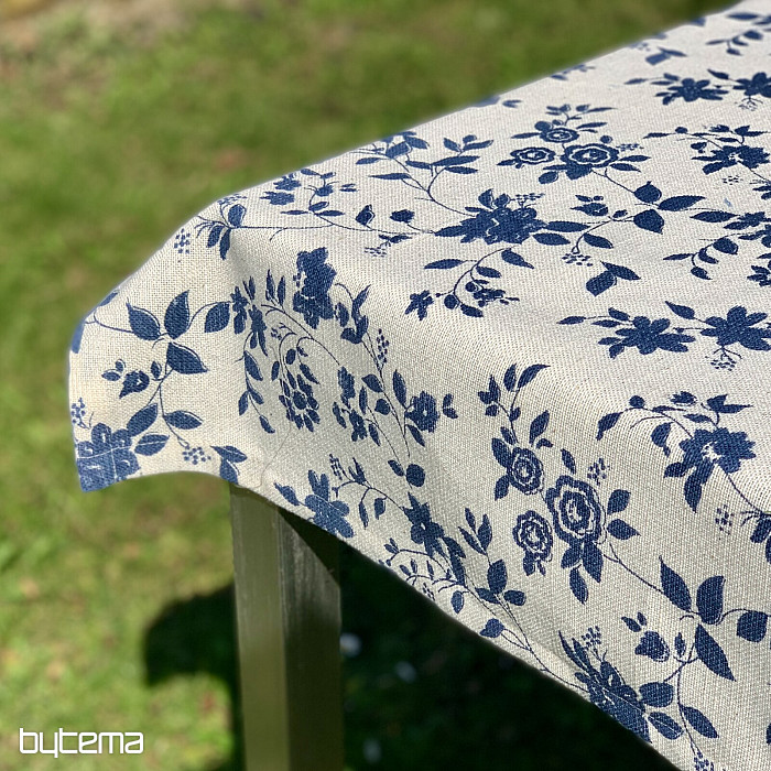 Nádherný vzor tmavomodrých kvetov na smotanovom podklade a jedinečný materiál s prímesou ľanu, luxusný obrus MODRÁ ROMANCE.
