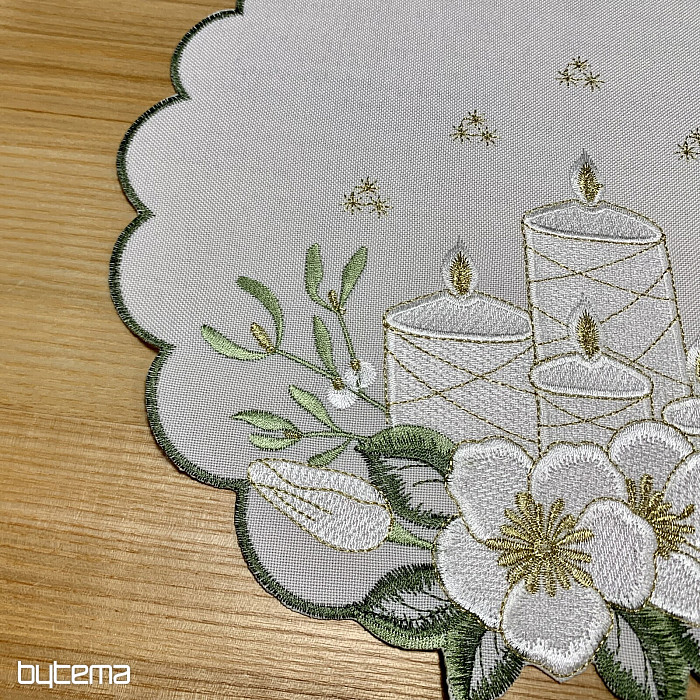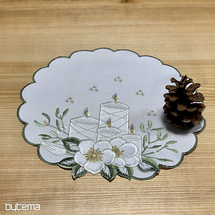 Vkusne a jemne vyšívaná vianočná prestierka s adventnými sviečkami v bielej farbe bude očarujúcim doplnkom u vás doma.