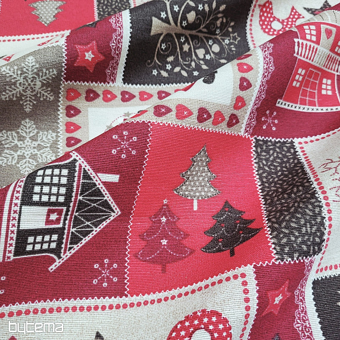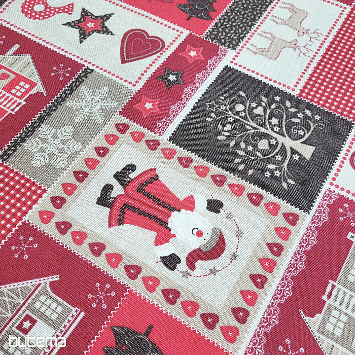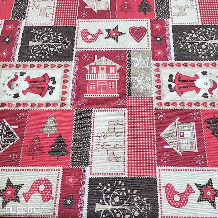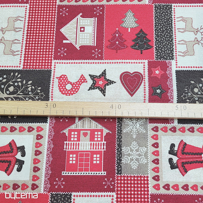 Dekoračná látka s vianočným patchworkovým dekorom, ktorá sa hodí pre interiéry v sedliackom a vidieckom štýle.