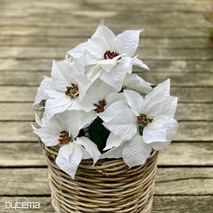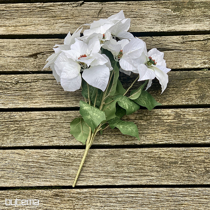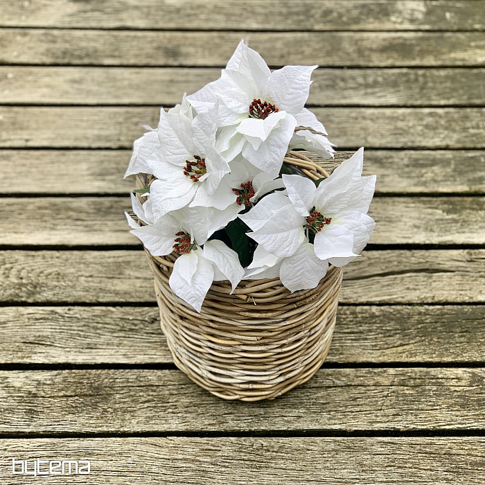 Veľká kytica červených kvetov v podarenom prevedení. V bohatom trse je sedem kvetov a mnoho listov. Kvetina vyzerá veľmi prirodzene a vďaka jej peknému vzhľadu získate pôsobivú dekoráciu v období Vianoc.