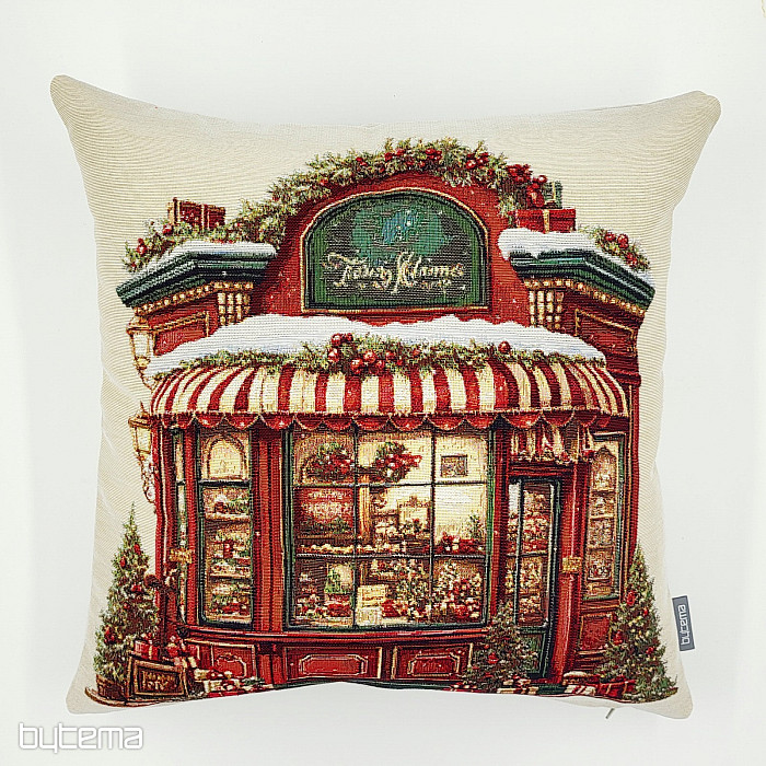 Gobelínový povlak s motívom vianočnej výlohy na rušnej ulici. Krásny vianočný doplnok do vášho domova.