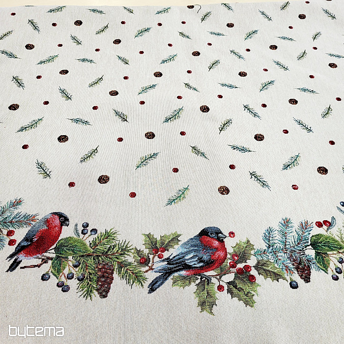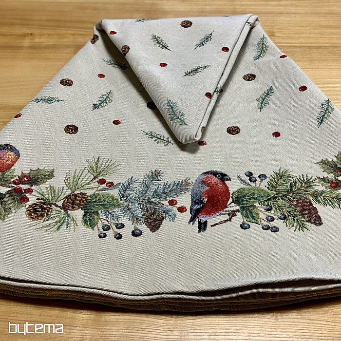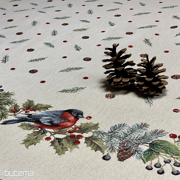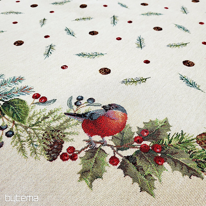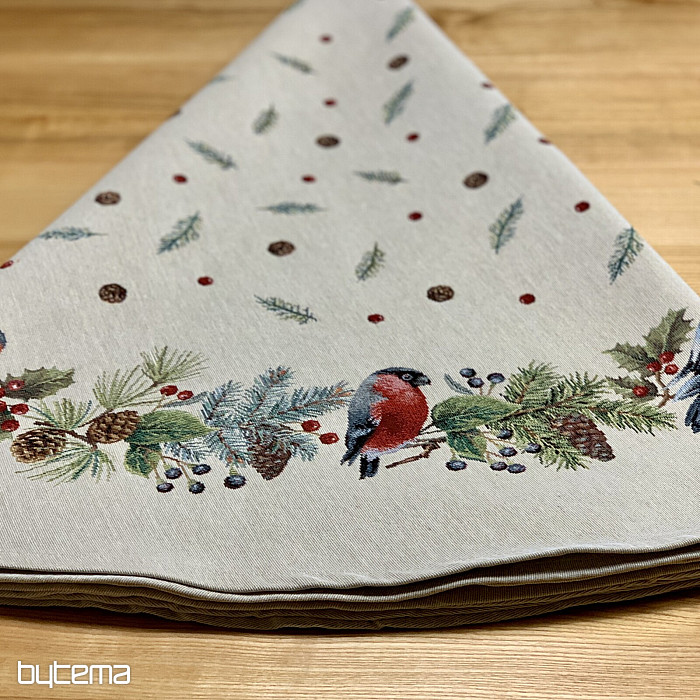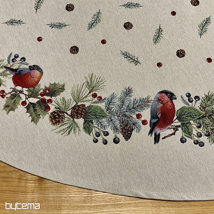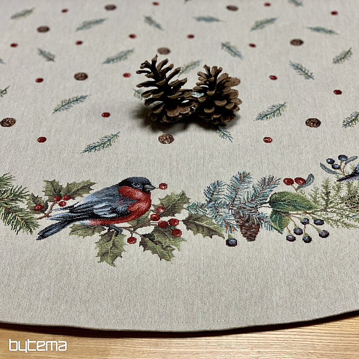 Vianočný okrúhly obrus z gobelínovej látky s motívom zimný vtáčik - hýl. Nebojte sa využiť tento obrus na dekoráciu pre vianočný čas.