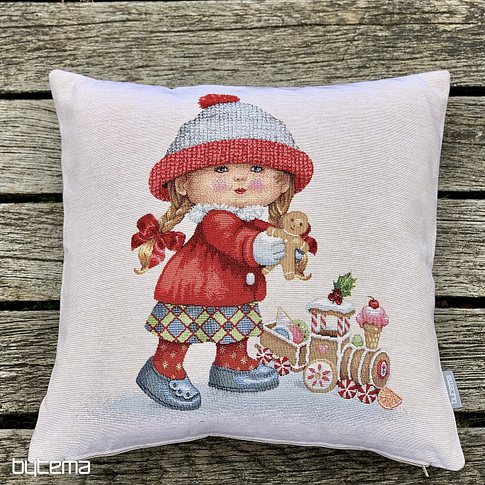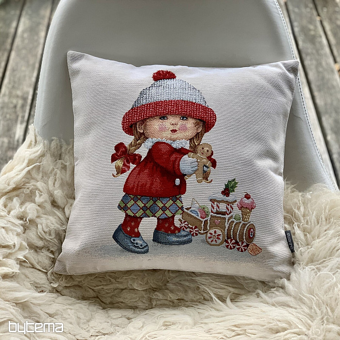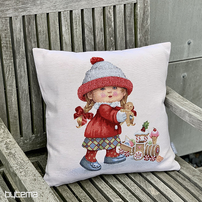 Gobelínový dekoračný vankúš so zimným motívom HOLČIČKY s hračkou je tak kúzelný.