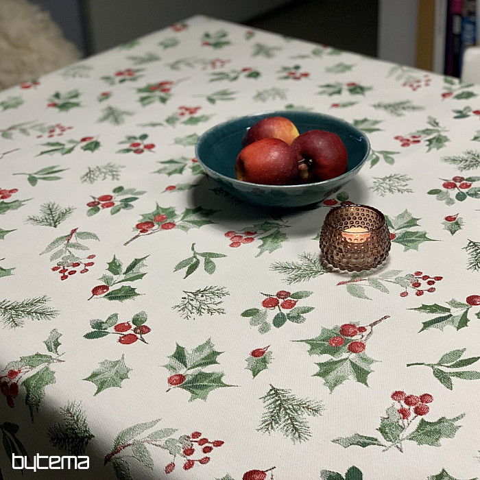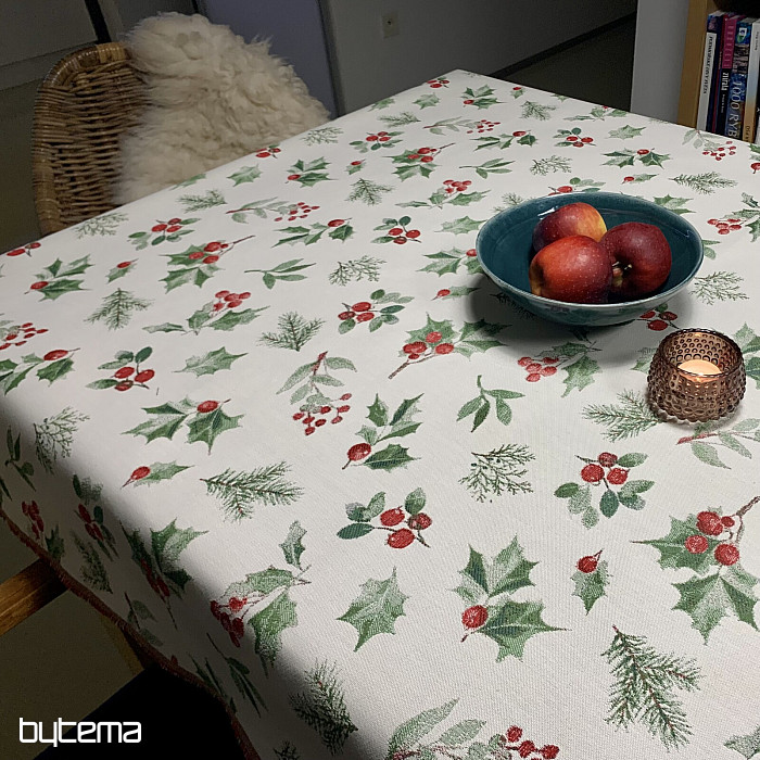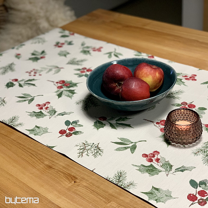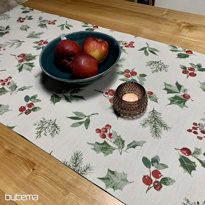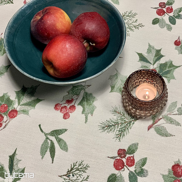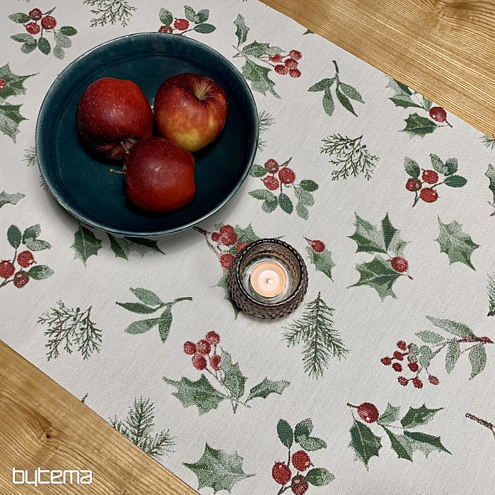 Vianočný obrus či šál z luxusnej látky s cezmínou a červenými plodmi, ktorý je symbolom Vianoc a hodí sa do všetkých interiérov, najmä v chladnejšom období roka.