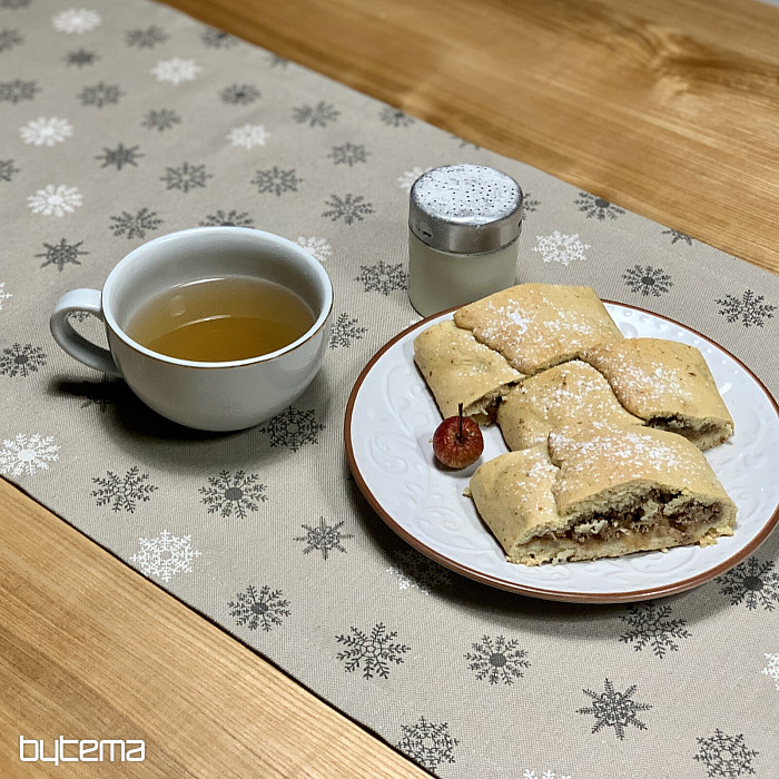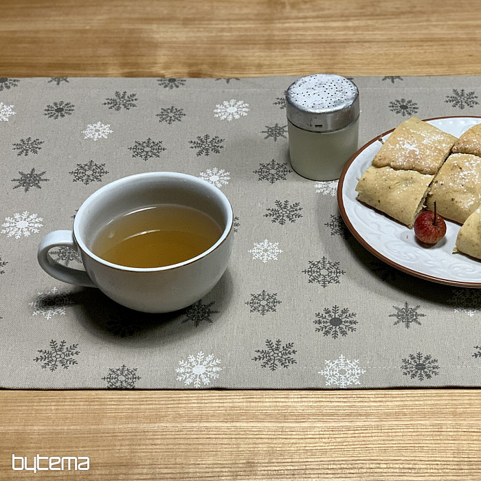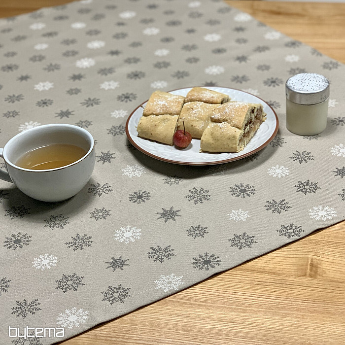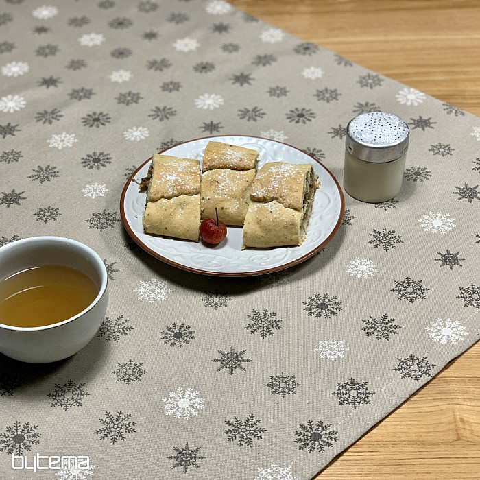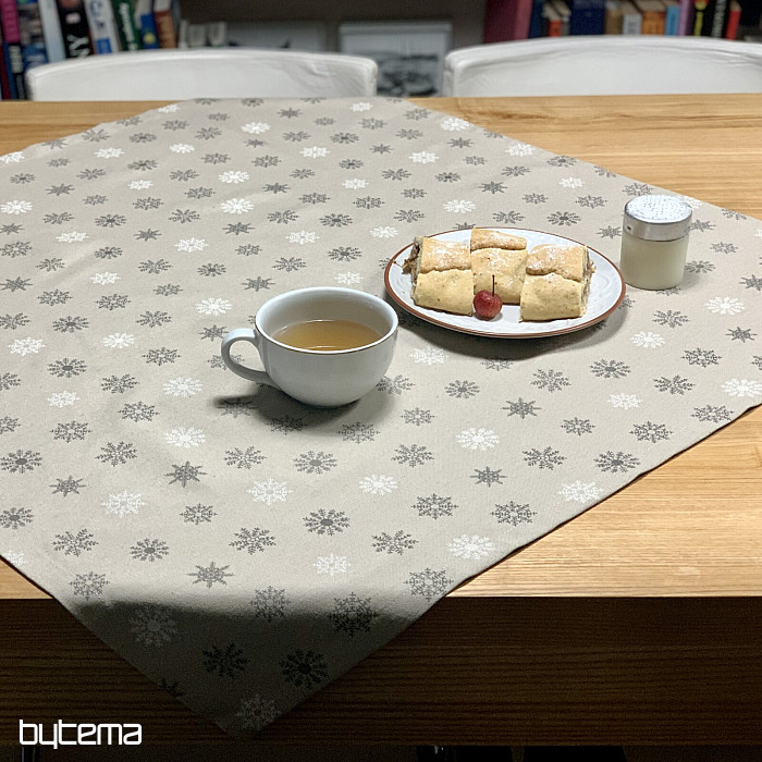Vianočné dekoračné obrusy a šály s dizajnom krásnych veľkých aj malých bielych a šedých vločiek na režnom podklade bude kúzelnou dekoráciou u vás doma.