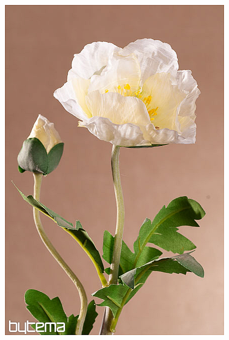 Vlčí mak s bielym kvetom a jedným pukom. Na stonke dlhom 69 cm je niekoľko listov. Kvetina je svojim spracovaním ľahko zameniteľná za tú živú, čo rastie na lúkach a na poliach.