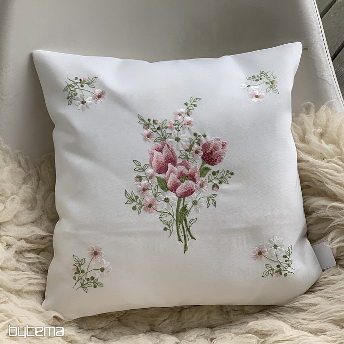 Nežná vyšívaný dekoračný povlak s kyticou ružových tulipánov.